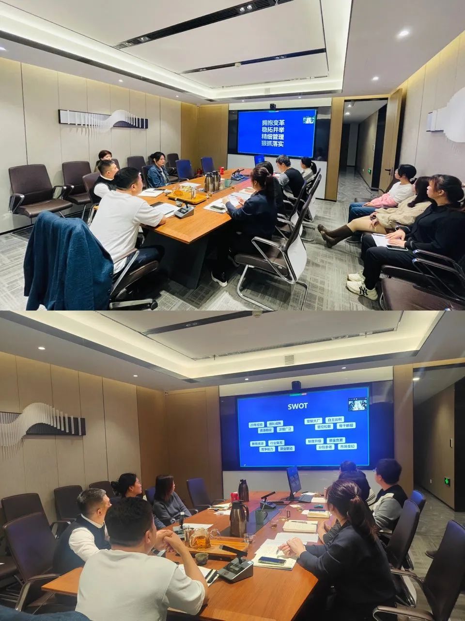 會議最后,公司總經理朱總作了主題為“擁抱變革 穩拓并舉 精細管理 狠抓落實”的匯報。朱總從國內外經濟現狀與經濟預測、行業市場政策分析與預判兩大維度指出,2023年建筑行業將迎來全面的蘇醒回暖,建筑上下游行業也一定會越好越好,我們今年也勢必迎來機會拐點。同時,朱總針對公司近三年總完成產值、人均產值以及公司的SWOT做了客觀全面的分析。面對已經到來的2023年,圍繞公司的發展方向、管理方向、用人方向,分別作了更高級別的戰略指示。